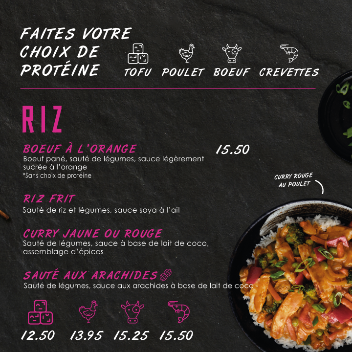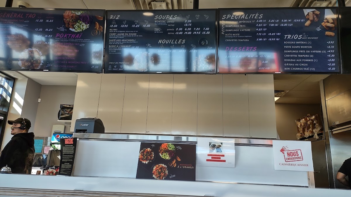 Highlights include the delicious Pokthai bowls, featuring both chicken and tofu options, artfully blended with fresh vegetables, jasmine rice, and a delightful mix of mayonnaise toppings. The prized Poulet General Tao and its vegetarian counterpart, Tao Choufleur, showcase perfectly pan-fried ingredients in a luscious General Tao sauce.